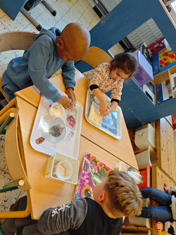 Nous lisons l'histoire Petit-Bleu et Petit-Jaune et mélangeons les couleurs primaires.