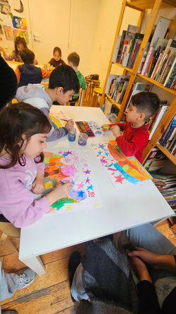 Après la lecture de l’album, les enfants ont observé les magnifiques paysages de l’histoire. Ensuite, ils se sont transformés en petits artistes ! À l’aide de différents outils et matériaux, ils ont créé leur propre décor nocturne de montagne inspiré du livre.
