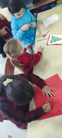 Nous avons d’abord tracé le contour et l’intérieur de notre sapin, il fallait respecter des mesures et être très précis pour que ce soit symétrique. Ensuite nous avons peint notre sapin à l’aide de notre index. Puis nous avons peaufiné le tout pour en faire une jolie carte…